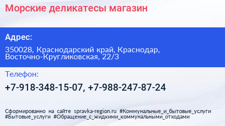 Морские деликатесы, магазин по адресу 350028, Краснодарский край, Краснодар, Восточно-Кругликовская, 22/3 в дальнейшем Организация, размещена в следующих категориях:
