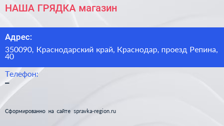 НАША ГРЯДКА, магазин по адресу 350090, Краснодарский край, Краснодар, проезд Репина, 40 в дальнейшем Организация, размещена в следующих категориях: