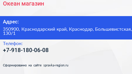 Океан, магазин по адресу 350900, Краснодарский край, Краснодар, Большевистская, 130/1 в дальнейшем Организация, размещена в следующих категориях:
