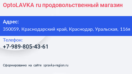 ОptoLAVKA.ru, продовольственный магазин по адресу 350059, Краснодарский край, Краснодар, Уральская, 116я в дальнейшем Организация, размещена в следующих категориях: