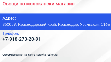 Овощи по-молокански, магазин по адресу 350059, Краснодарский край, Краснодар, Уральская, 116Б в дальнейшем Организация, размещена в следующих категориях: