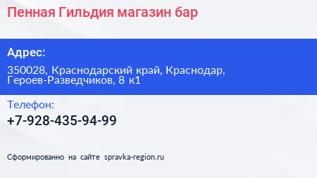 Пенная Гильдия, магазин-бар по адресу 350028, Краснодарский край, Краснодар, Героев-Разведчиков, 8 к1 в дальнейшем Организация, размещена в следующих категориях:
