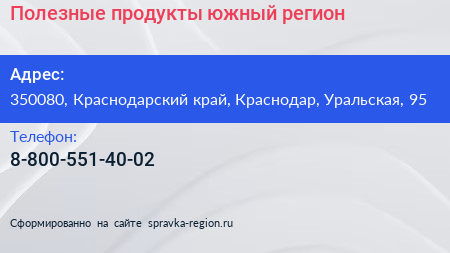 Полезные продукты южный регион по адресу 350080, Краснодарский край, Краснодар, Уральская, 95 в дальнейшем Организация, размещена в следующих категориях: