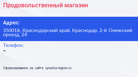 Продовольственный магазин по адресу 350018, Краснодарский край, Краснодар, 2-й Онежский проезд, 24 в дальнейшем Организация, размещена в следующих категориях: