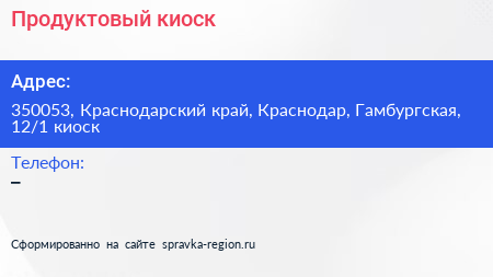 Продуктовый киоск по адресу 350053, Краснодарский край, Краснодар, Гамбургская, 12/1 киоск в дальнейшем Организация, размещена в следующих категориях: