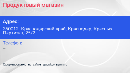 Продуктовый магазин по адресу 350012, Краснодарский край, Краснодар, Красных Партизан, 25/2 в дальнейшем Организация, размещена в следующих категориях: