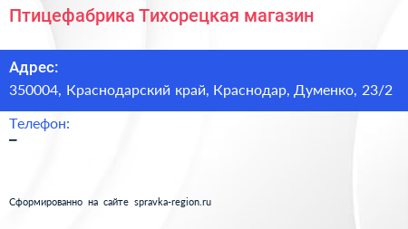 Птицефабрика Тихорецкая, магазин по адресу 350004, Краснодарский край, Краснодар, Думенко, 23/2 в дальнейшем Организация, размещена в следующих категориях: