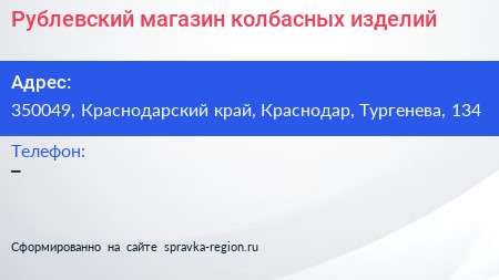 Рублевский, магазин колбасных изделий по адресу 350049, Краснодарский край, Краснодар, Тургенева, 134 в дальнейшем Организация, размещена в следующих категориях: