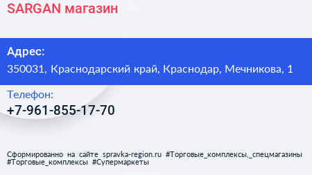 SARGAN, магазин по адресу 350031, Краснодарский край, Краснодар, Мечникова, 1 в дальнейшем Организация, размещена в следующих категориях: