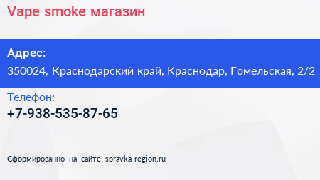 Vape.smoke, магазин по адресу 350024, Краснодарский край, Краснодар, Гомельская, 2/2 в дальнейшем Организация, размещена в следующих категориях: