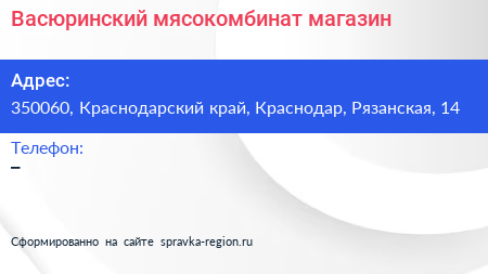Васюринский мясокомбинат, магазин по адресу 350060, Краснодарский край, Краснодар, Рязанская, 14 в дальнейшем Организация, размещена в следующих категориях: