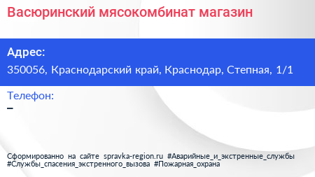Васюринский мясокомбинат, магазин по адресу 350056, Краснодарский край, Краснодар, Степная, 1/1 в дальнейшем Организация, размещена в следующих категориях: