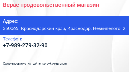 Верас, продовольственный магазин по адресу 350065, Краснодарский край, Краснодар, Невкипелого, 2 в дальнейшем Организация, размещена в следующих категориях: