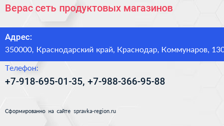 Верас, сеть продуктовых магазинов по адресу 350000, Краснодарский край, Краснодар, Коммунаров, 130 в дальнейшем Организация, размещена в следующих категориях: