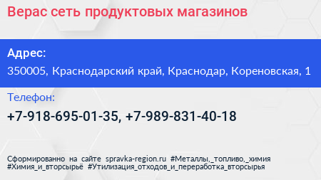 Верас, сеть продуктовых магазинов по адресу 350005, Краснодарский край, Краснодар, Кореновская, 1 в дальнейшем Организация, размещена в следующих категориях: