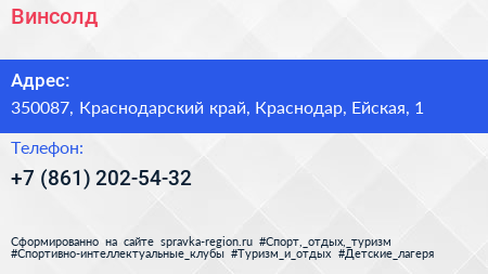 Винсолд по адресу 350087, Краснодарский край, Краснодар, Ейская, 1 в дальнейшем Организация, размещена в следующих категориях: