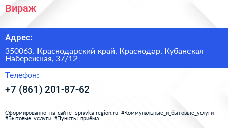 Вираж по адресу 350063, Краснодарский край, Краснодар, Кубанская Набережная, 37/12 в дальнейшем Организация, размещена в следующих категориях:
