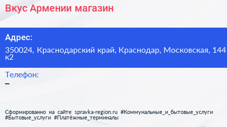 Вкус Армении, магазин по адресу 350024, Краснодарский край, Краснодар, Московская, 144 к2 в дальнейшем Организация, размещена в следующих категориях:
