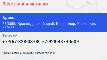 Вкус жизни, магазин по адресу 350088, Краснодарский край, Краснодар, Уральская, 216/1а в дальнейшем Организация, размещена в следующих категориях: