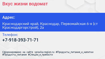 Вкус жизни, водомат по адресу Краснодарский край, Краснодар, Первомайская 6-я (ст Краснодаргорстрой), 2а в дальнейшем Организация, размещена в следующих категориях: