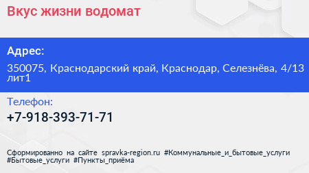 Вкус жизни, водомат по адресу 350075, Краснодарский край, Краснодар, Селезнёва, 4/13 лит1 в дальнейшем Организация, размещена в следующих категориях: