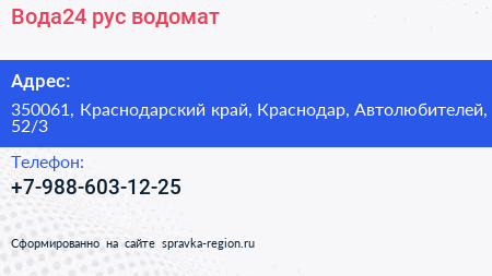 Вода24.рус, водомат по адресу 350061, Краснодарский край, Краснодар, Автолюбителей, 52/3 в дальнейшем Организация, размещена в следующих категориях: