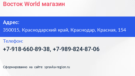 Восток World, магазин по адресу 350015, Краснодарский край, Краснодар, Красная, 154 в дальнейшем Организация, размещена в следующих категориях:
