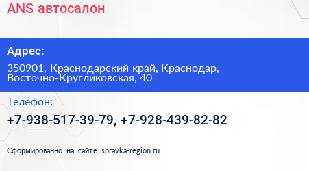ANS, автосалон по адресу 350901, Краснодарский край, Краснодар, Восточно-Кругликовская, 40 в дальнейшем Организация, размещена в следующих категориях: