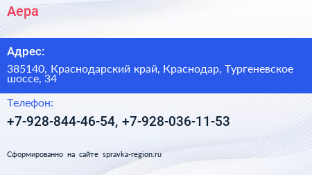 Аера по адресу 385140, Краснодарский край, Краснодар, Тургеневское шоссе, 34 в дальнейшем Организация, размещена в следующих категориях: