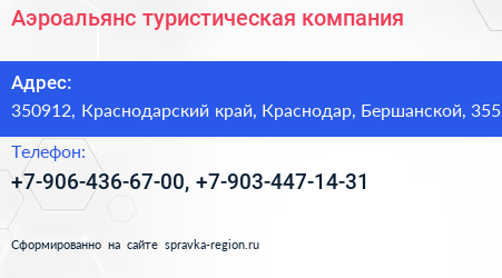 Аэроальянс, туристическая компания по адресу 350912, Краснодарский край, Краснодар, Бершанской, 355 в дальнейшем Организация, размещена в следующих категориях: