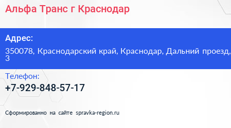 Альфа-Транс, г. Краснодар по адресу 350078, Краснодарский край, Краснодар, Дальний проезд, 3 в дальнейшем Организация, размещена в следующих категориях: