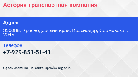 Астория, транспортная компания по адресу 350088, Краснодарский край, Краснодар, Сормовская, 204Б в дальнейшем Организация, размещена в следующих категориях: