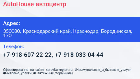 AutoHouse, автоцентр по адресу 350080, Краснодарский край, Краснодар, Бородинская, 170 в дальнейшем Организация, размещена в следующих категориях: