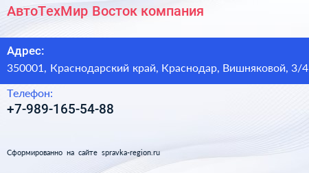АвтоТехМир-Восток, компания по адресу 350001, Краснодарский край, Краснодар, Вишняковой, 3/4 в дальнейшем Организация, размещена в следующих категориях: