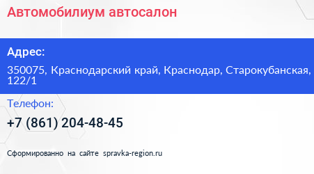 Автомобилиум, автосалон по адресу 350075, Краснодарский край, Краснодар, Старокубанская, 122/1 в дальнейшем Организация, размещена в следующих категориях: