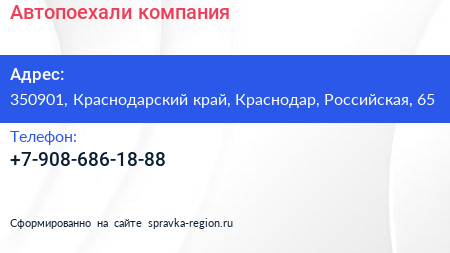 Автопоехали, компания по адресу 350901, Краснодарский край, Краснодар, Российская, 65 в дальнейшем Организация, размещена в следующих категориях: