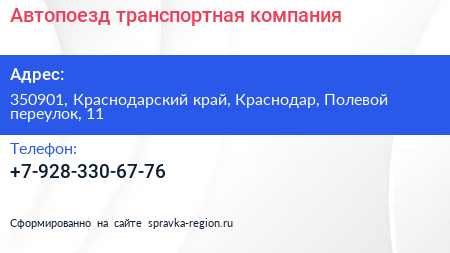 Автопоезд, транспортная компания по адресу 350901, Краснодарский край, Краснодар, Полевой переулок, 11 в дальнейшем Организация, размещена в следующих категориях: