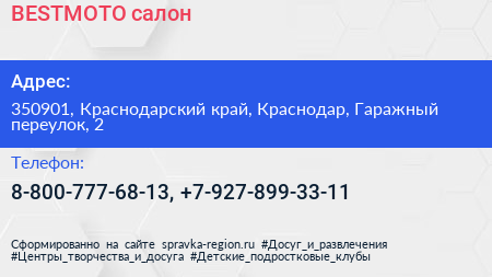 BESTMOTO, салон по адресу 350901, Краснодарский край, Краснодар, Гаражный переулок, 2 в дальнейшем Организация, размещена в следующих категориях: