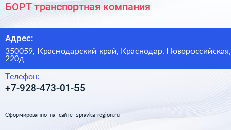 БОРТ, транспортная компания по адресу 350059, Краснодарский край, Краснодар, Новороссийская, 220д в дальнейшем Организация, размещена в следующих категориях: