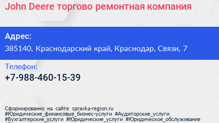 John Deere, торгово-ремонтная компания по адресу 385140, Краснодарский край, Краснодар, Связи, 7 в дальнейшем Организация, размещена в следующих категориях: