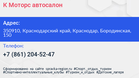 К-Моторс, автосалон по адресу 350910, Краснодарский край, Краснодар, Бородинская, 150 в дальнейшем Организация, размещена в следующих категориях: