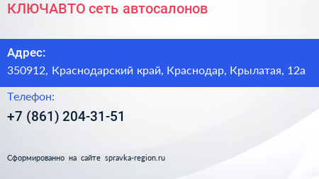 КЛЮЧАВТО, сеть автосалонов по адресу 350912, Краснодарский край, Краснодар, Крылатая, 12а в дальнейшем Организация, размещена в следующих категориях: