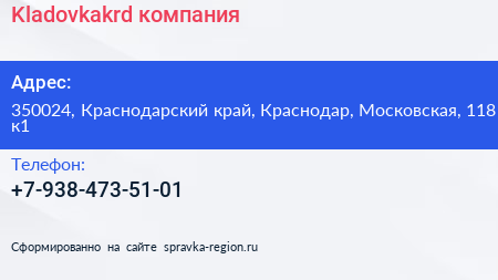 Kladovkakrd, компания по адресу 350024, Краснодарский край, Краснодар, Московская, 118 к1 в дальнейшем Организация, размещена в следующих категориях: