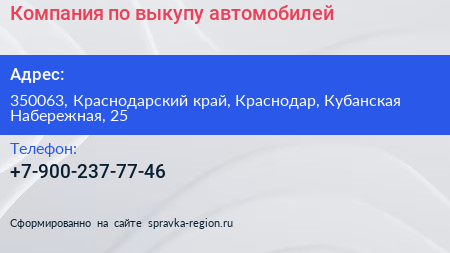 Компания по выкупу автомобилей по адресу 350063, Краснодарский край, Краснодар, Кубанская Набережная, 25 в дальнейшем Организация, размещена в следующих категориях: