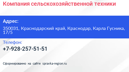 Компания сельскохозяйственной техники по адресу 350031, Краснодарский край, Краснодар, Карла Гусника, 17/5 в дальнейшем Организация, размещена в следующих категориях:
