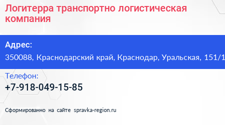 Логитерра, транспортно-логистическая компания по адресу 350088, Краснодарский край, Краснодар, Уральская, 151/1 в дальнейшем Организация, размещена в следующих категориях: