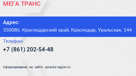 МЕГА ТРАНС по адресу 350080, Краснодарский край, Краснодар, Уральская, 144 в дальнейшем Организация, размещена в следующих категориях: