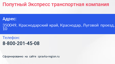 Попутный Экспресс, транспортная компания по адресу 350049, Краснодарский край, Краснодар, Луговой проезд, 10 в дальнейшем Организация, размещена в следующих категориях:
