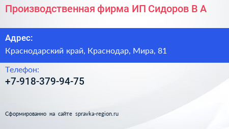 Производственная фирма, ИП Сидоров В.А. по адресу Краснодарский край, Краснодар, Мира, 81 в дальнейшем Организация, размещена в следующих категориях: