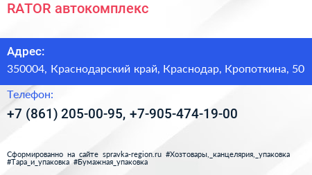 RATOR, автокомплекс по адресу 350004, Краснодарский край, Краснодар, Кропоткина, 50 в дальнейшем Организация, размещена в следующих категориях: